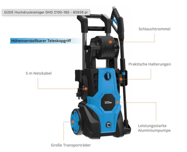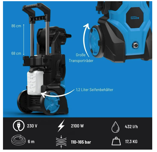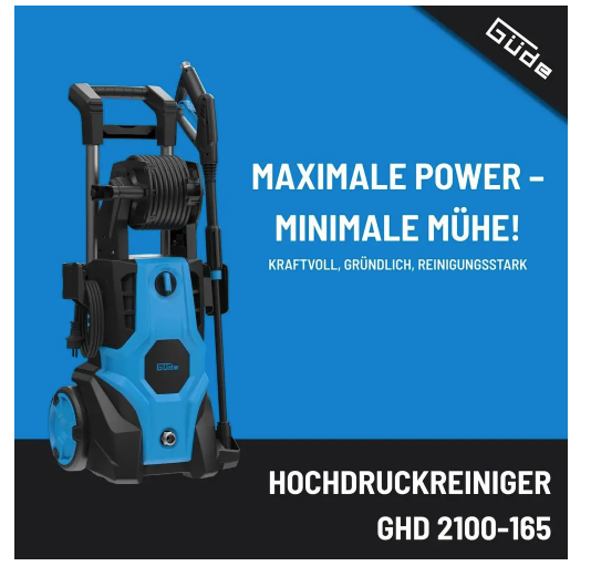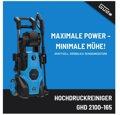 Der Güde Hochdruckreiniger GHD 2100-165 überzeugt durch Qualität und Benutzerfreundlichkeit. Mit dem Auto-Stopp-System und integriertem Reinigungsmittelbehälter bietet er intuitive Bedienung und effektive Reinigung. Der höhenverstellbare Teleskopgriff und große Transporträder garantieren Mobilität und Ergonomie. Praktische Halterungen für Zubehör, Schlauch und Kabel sorgen für Ordnung. Herzstück des Geräts sind der langlebige Induktionsmotor und die leistungsstarke Aluminiumpumpe. Das Ergebnis: Ein Hochdruckreiniger, der in Leistung, Komfort und Langlebigkeit punktet.