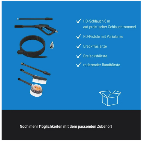 Hochdruckreiniger, HD-Schlauch 6 m auf praktischer Schlauchtrommel, HD-Pistole mit Variolanze, Dreckfräslanze, Dreiecksbürste und rotierender Rundbürste